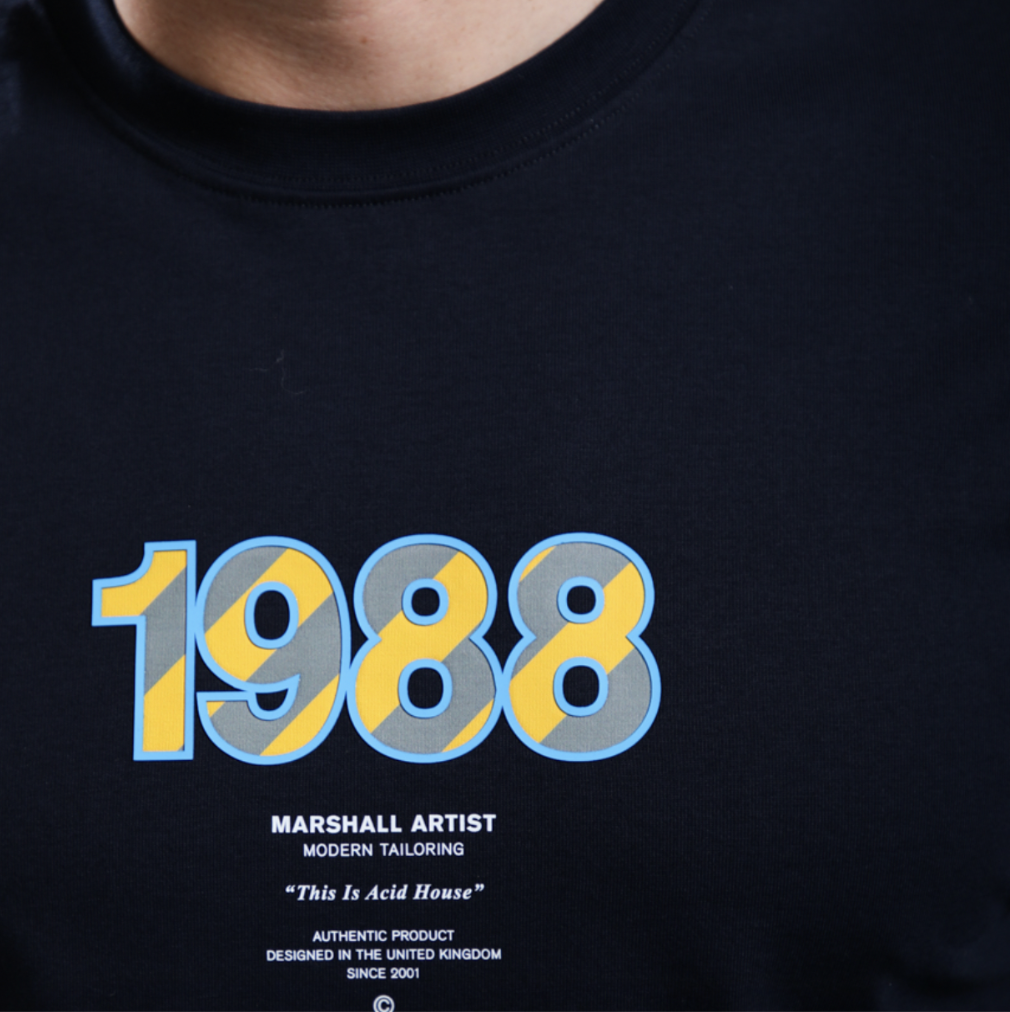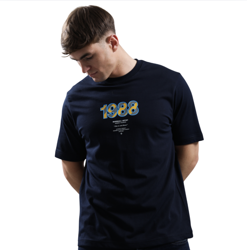 The Marshall Artist Acid House T-Shirt in Navy brings bold graphic style to a classic everyday essential. Designed to stand out while keeping things wearable, this tee blends contemporary streetwear influence with a timeless silhouette.