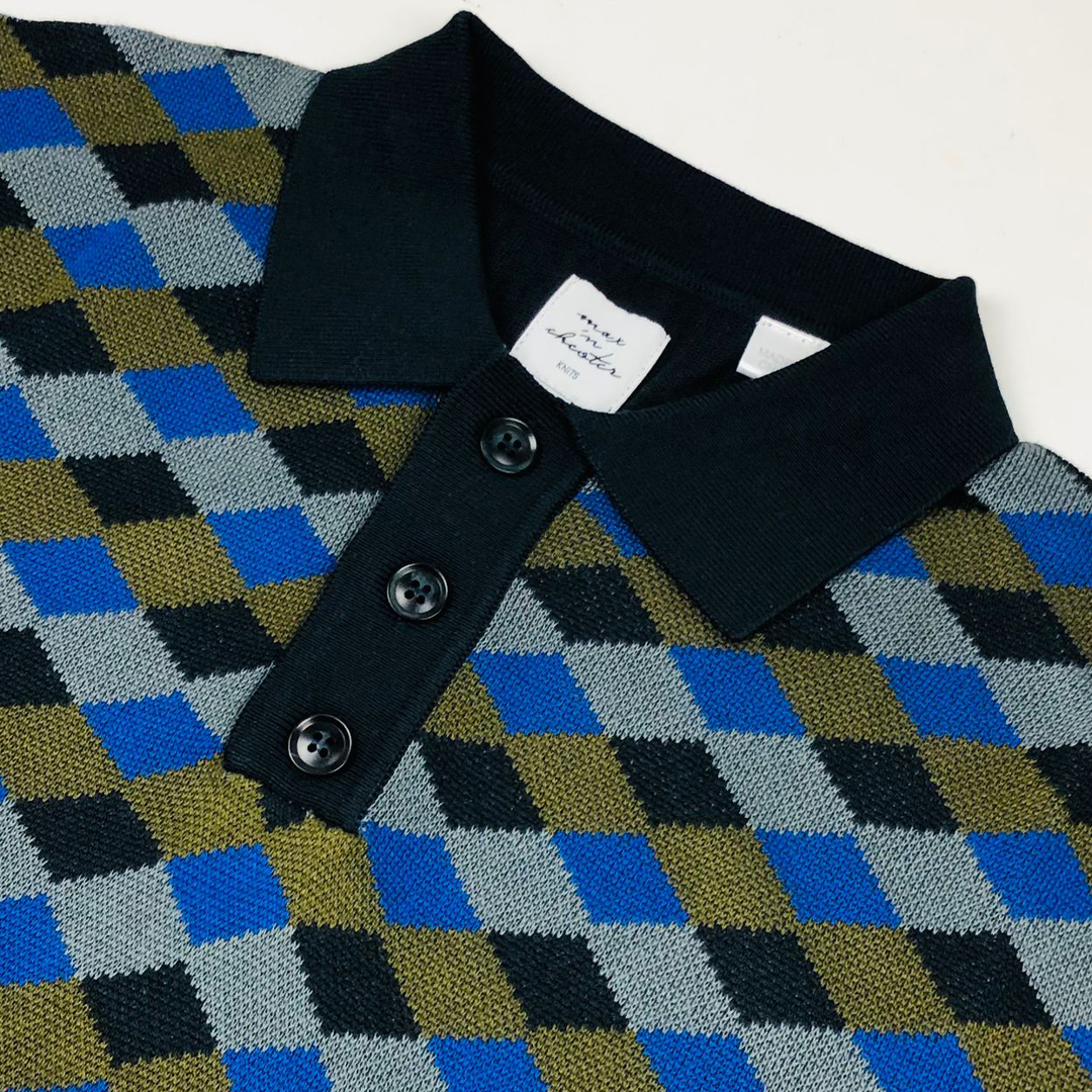 The small diamond knit pattern adds depth and character to the contrasting navy and deep moss tones, giving this piece a polished yet contemporary aesthetic. Designed with a short-sleeve silhouette and tailored profile, it’s perfect for effortless transitions from work to weekend.